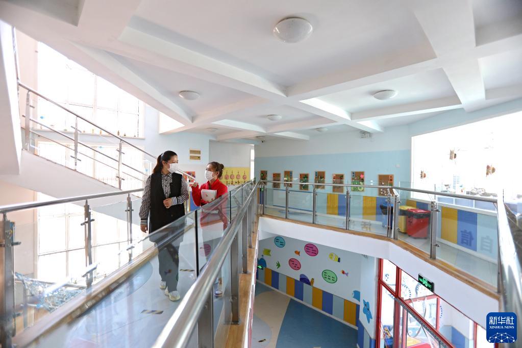 6月1日,牟苹丽和一名老师在幼儿园里交流教学情况。新华社记者 姚剑锋 摄