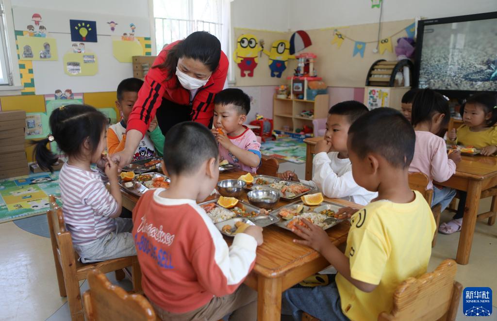 6月1日,牟苹丽在幼儿园协助小班的小朋友吃午饭。新华社记者 王乙杰 摄