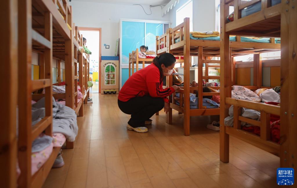 6月1日,午休时间,牟苹丽在班级寝室里哄小朋友入睡。新华社记者 王乙杰 摄