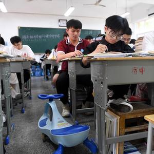 张亮骑上扭扭车,轻快地穿过走廊,进入教室。到了座位边,他双手一撑,熟练地坐上椅子,投入到高考前紧张的复习备考中。