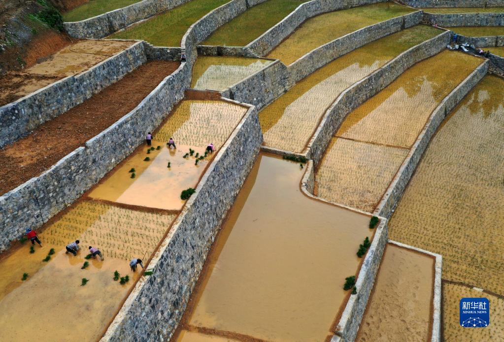 6月6日,农民在贵州省遵义市正安县瑞溪镇三把车村田间插秧(无人机照片)。