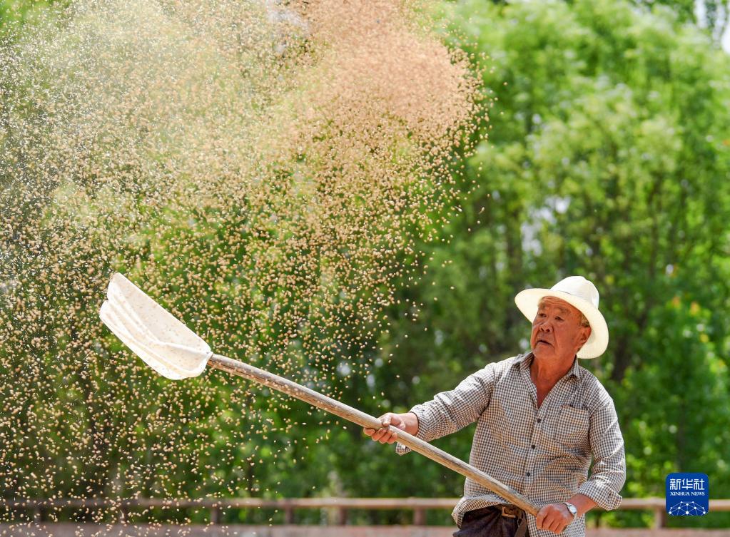 6月6日,农民在山东省胶州市九龙街道车家河村扬麦子。