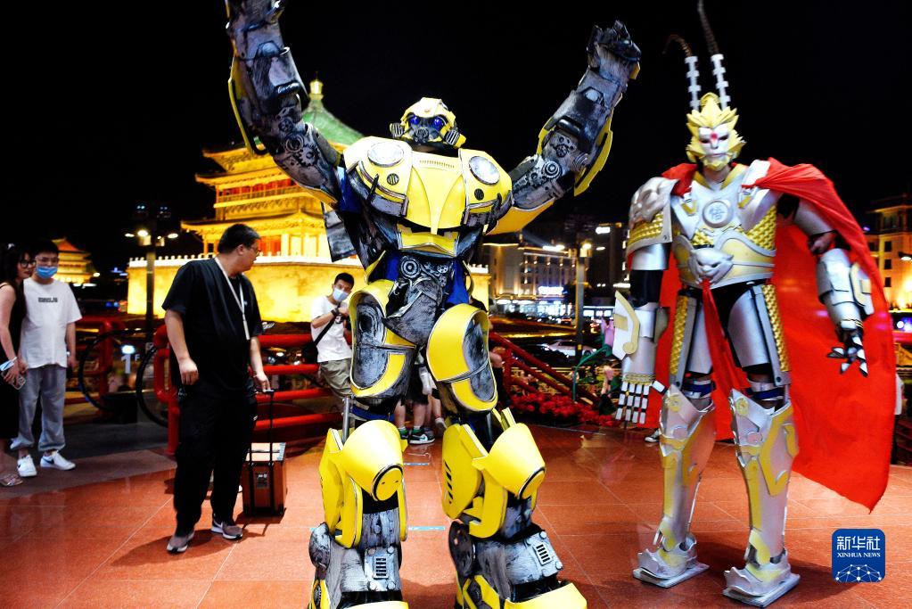 西安钟楼附近一商场外工作人员身着影视人物服饰吸引顾客(6月5日摄)。 新华社记者 刘潇 摄