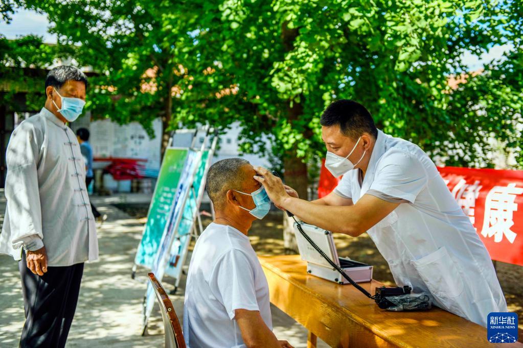 6月6日,医务人员在河北省遵化市侯家寨乡北张庄子村给村民检查视力。