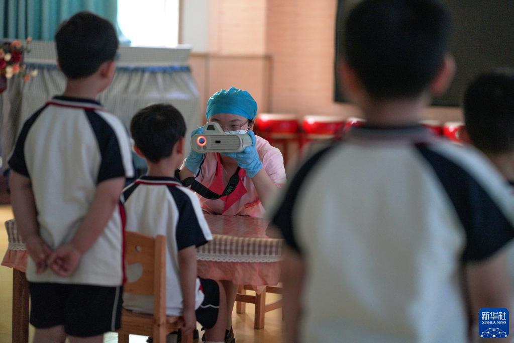 6月6日,在河北省邢台市内丘县第二幼儿园,医务人员为小朋友检测视力。