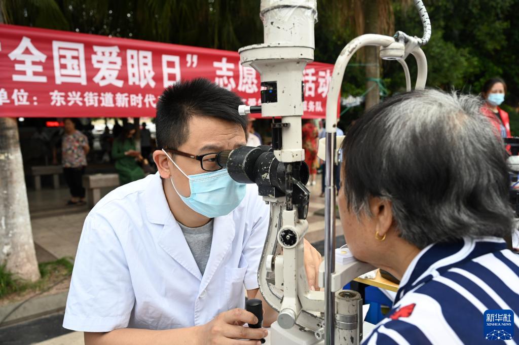 6月6日,在四川省内江市东兴区大千广场,眼科专家为市民进行免费义诊。
