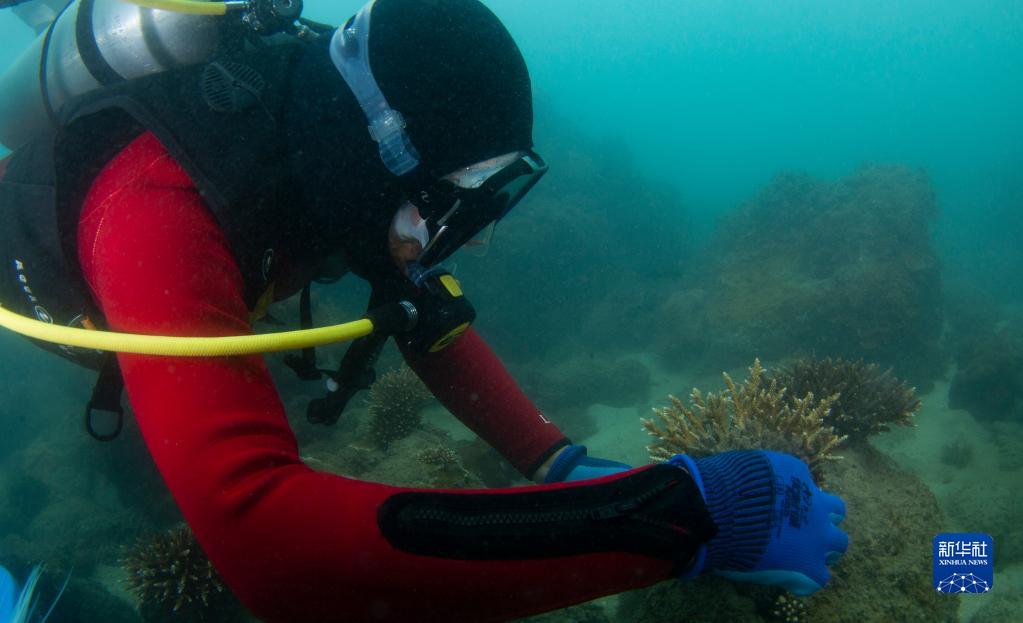 5月12日,在海南省三亚市西岛海域,吴川良在查看海底珊瑚生长情况。