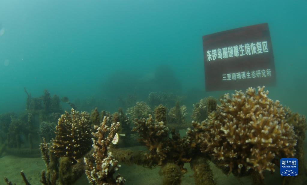 这是海南省三亚市崖州湾东锣岛海域的珊瑚礁生境恢复区(2021年3月18日摄)。