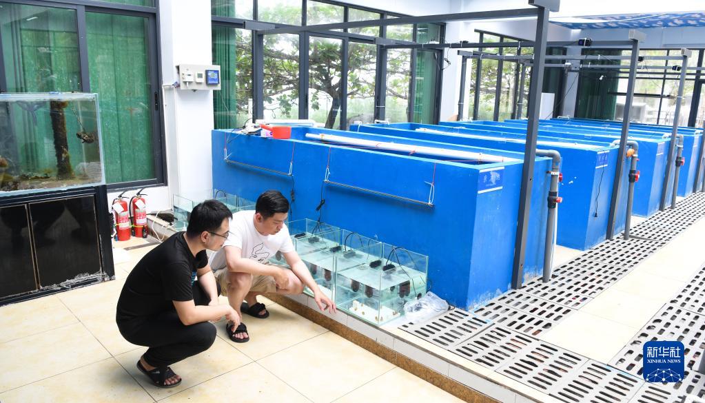 5月12日,在位于海南省三亚市西岛的三亚珊瑚礁生态研究所科研基地,吴川良(右)与同事在查看珊瑚生长情况。
