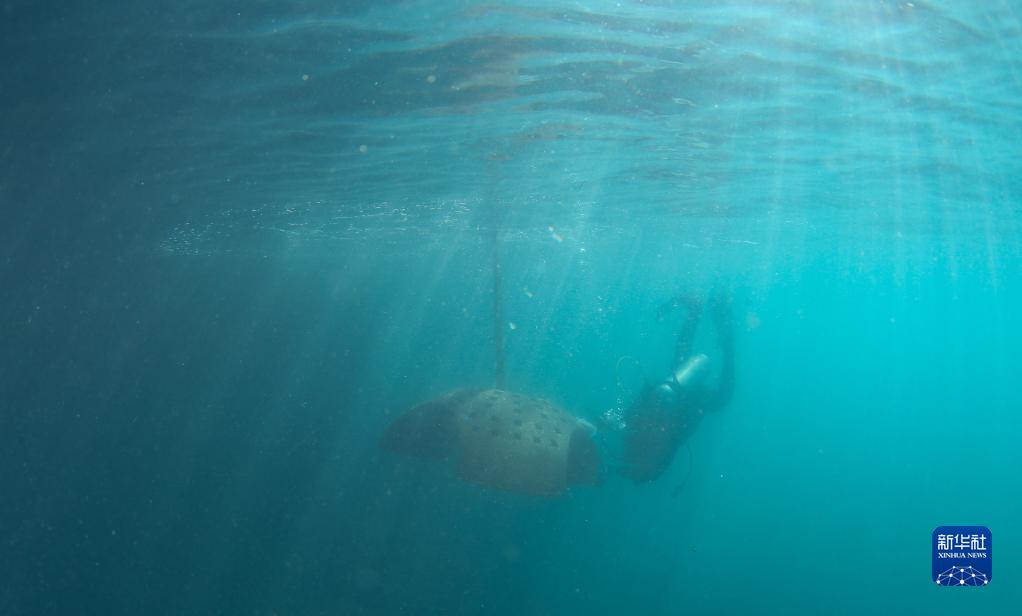 1月19日,在海南省三亚市亚龙湾海域,潜水员将人工生态礁移至海底指定区域。