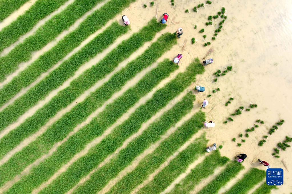 6月7日,村民在贵州省黔东南苗族侗族自治州岑巩县大有镇腊恰畈村整理秧苗(无人机照片)。