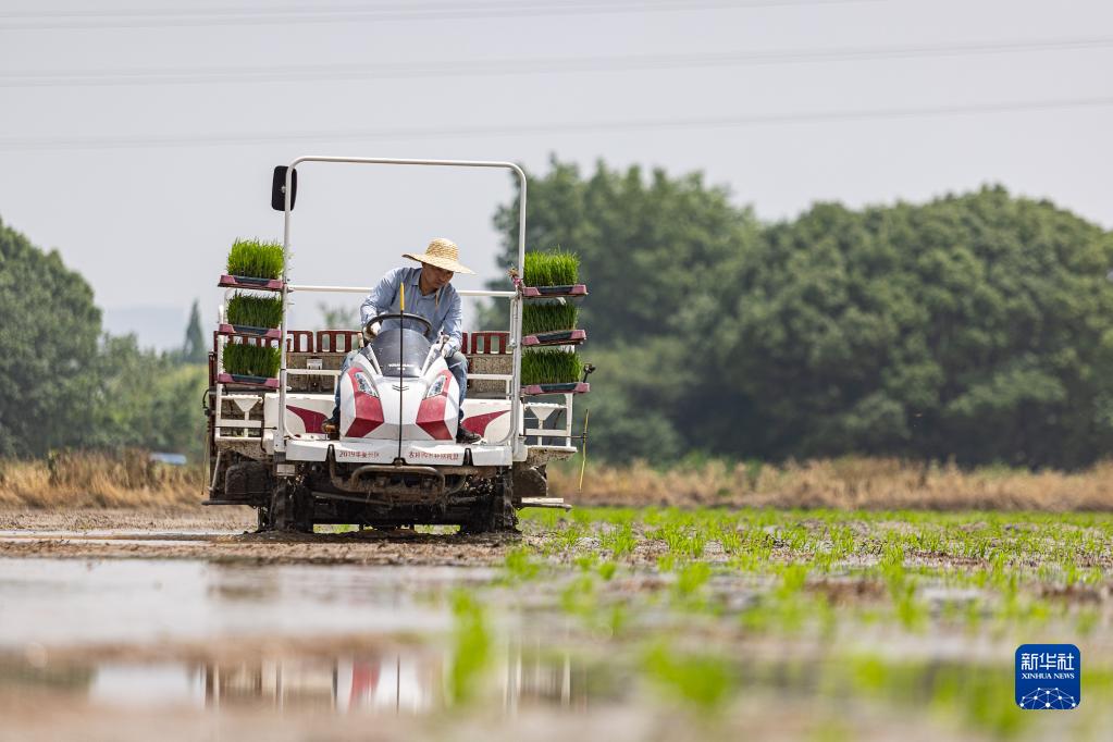 6月7日,在浙江省湖州市八里店镇,村民操作农机在田间插秧。