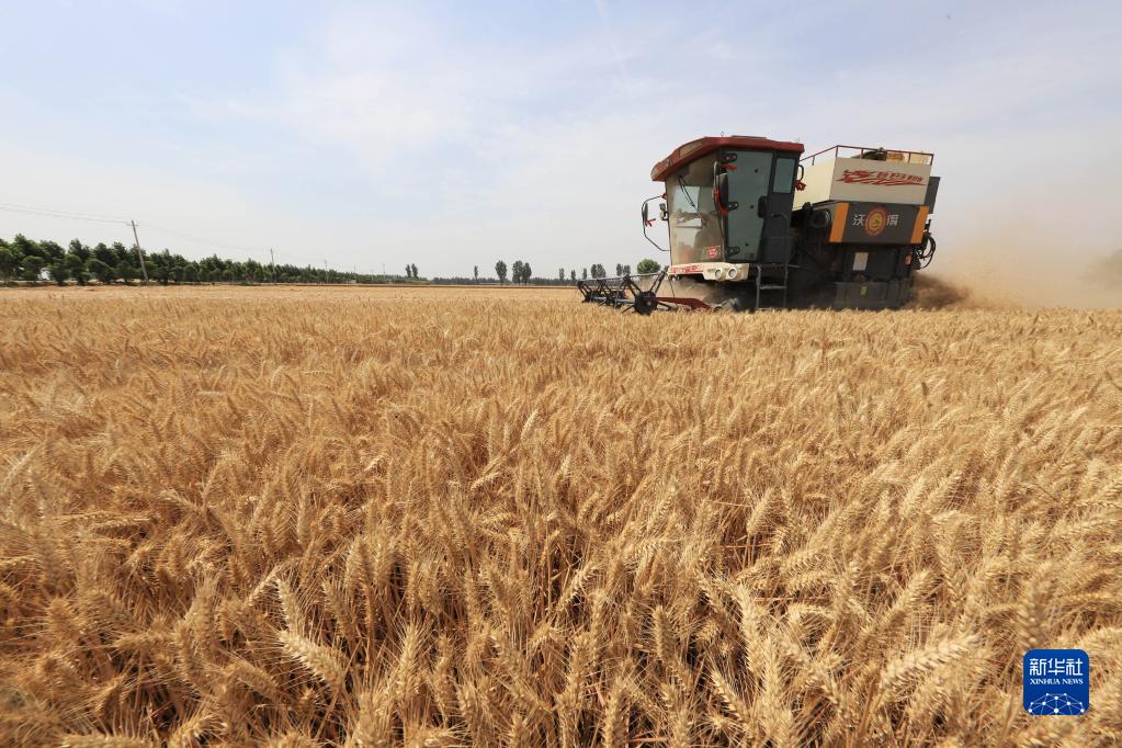 6月7日,在河南省焦作市温县武德镇田冯蔺村,农民操作收割机在田间收获小麦。