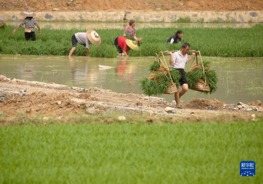 6月7日,村民在贵州省铜仁市玉屏侗族自治县新店镇沙水坪村的田间运秧。