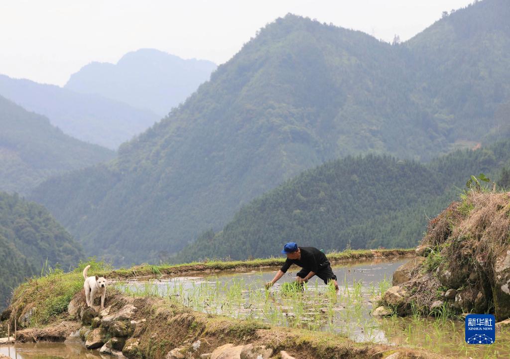 6月7日,村民在贵州省从江县宰别村的田间插秧。