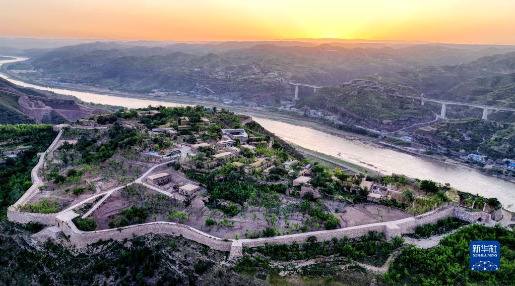 这是6月8日拍摄的朝霞映照下的吴堡石城(无人机照片)。