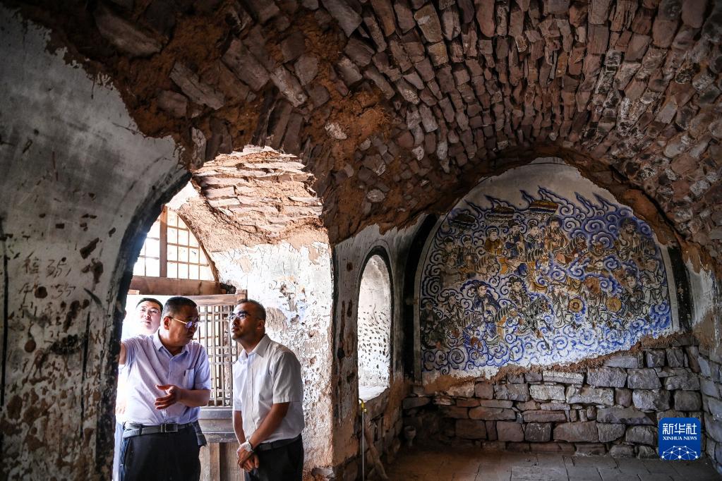 6月7日,吴堡县文物保护所所长慕生树(中)在石城衙神庙里介绍壁画。