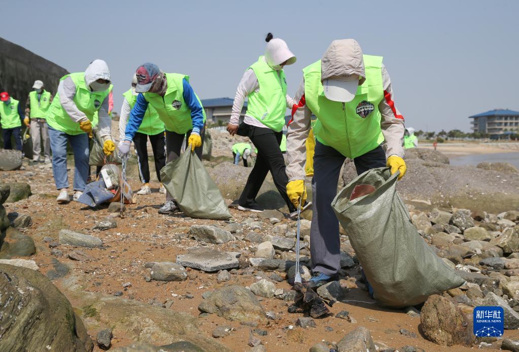 6月8日,志愿者在江苏连云港海州湾国家级海洋公园清理海滩上的垃圾。