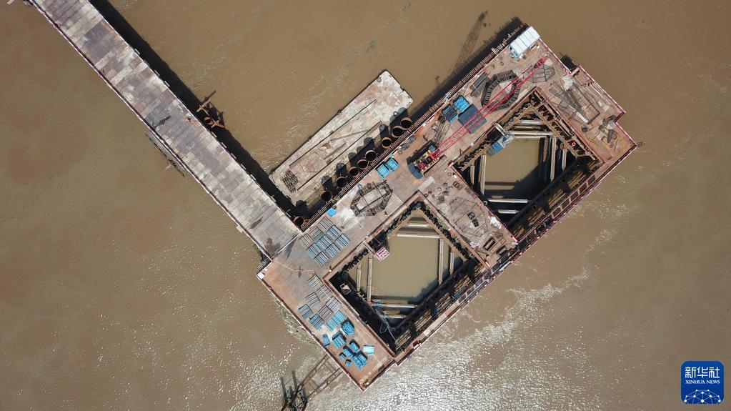 在长沙暮坪湘江特大桥施工现场,工作人员进行施工作业(6月8日摄,无人机照片)。