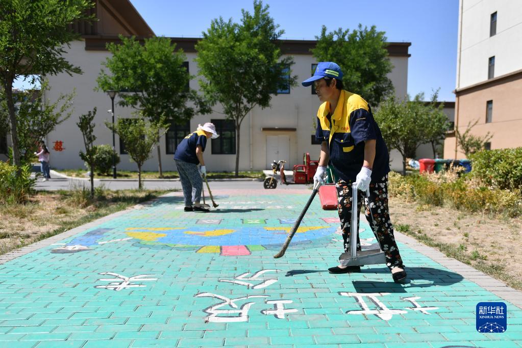 6月7日,归德街道滩区外迁村民王祥菊(右)在社区从事保洁工作。