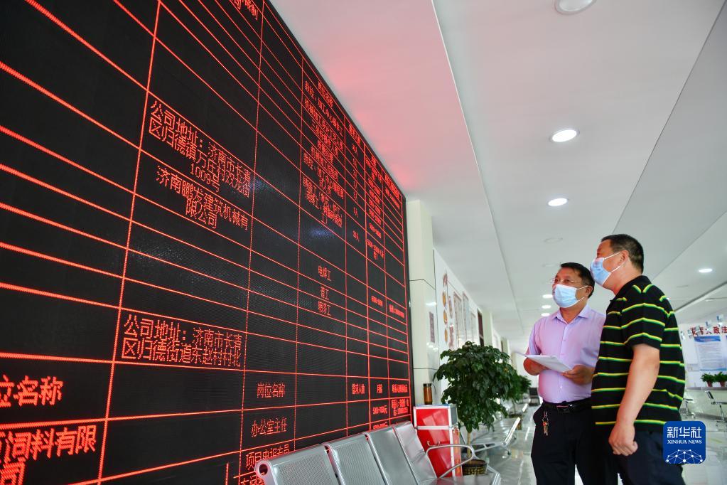 6月8日,归德街道人社部门工作人员(左)向前来求职的滩区村民介绍招聘信息。