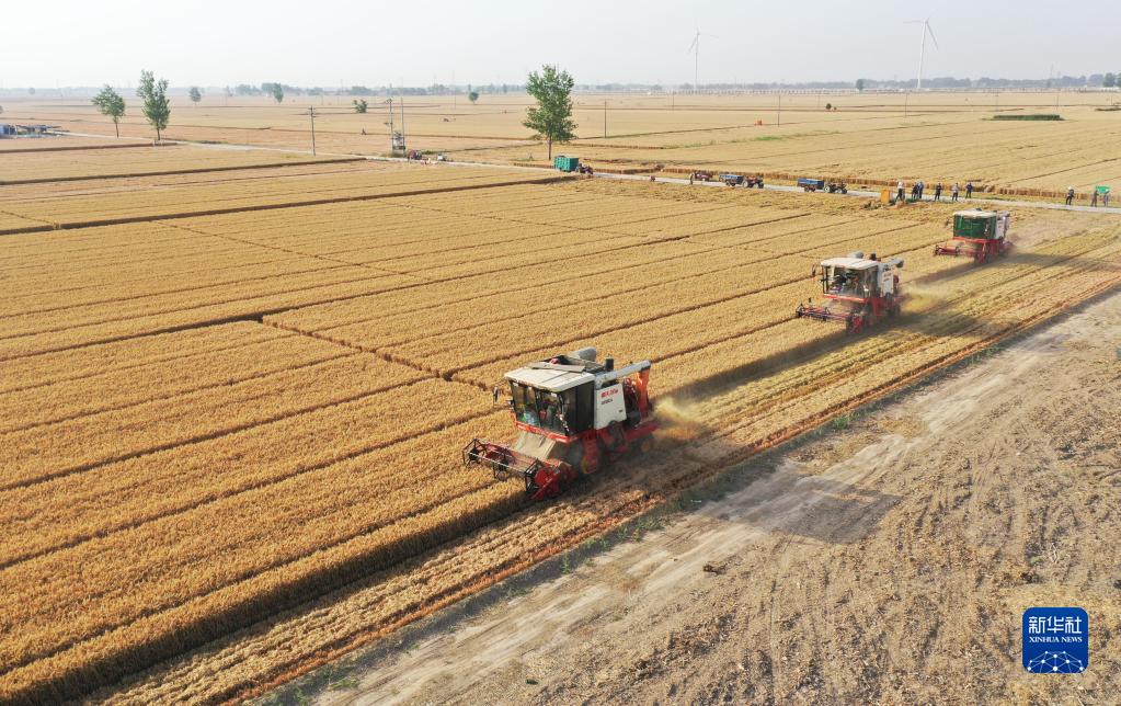 河南省安阳市滑县有“中国小麦第一县”之称。“三夏”时节,当地农民利用晴好天气抢收小麦,确保颗粒归仓。截至6月7日,滑县181.2万亩小麦已收获121.7万亩。
