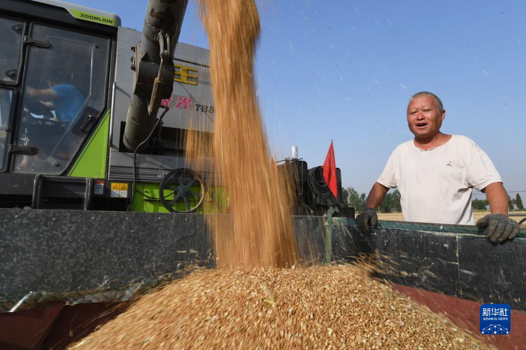 河南省安阳市滑县有“中国小麦第一县”之称。“三夏”时节,当地农民利用晴好天气抢收小麦,确保颗粒归仓。截至6月7日,滑县181.2万亩小麦已收获121.7万亩。