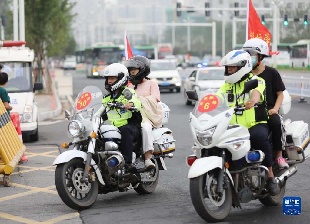 6月8日,在湖南省永州市道县第一中学考点外,交警用摩托车送学生到考点。
