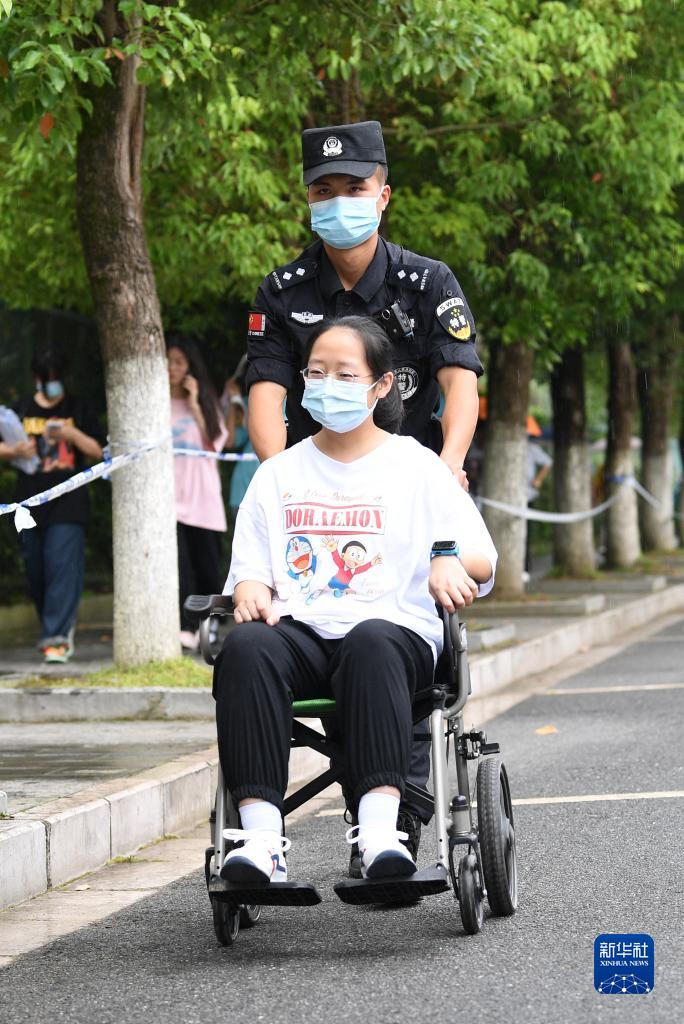 6月8日,在贵州省遵义市第四中学考点,执勤民警帮助行动不便的考生离开考场。
