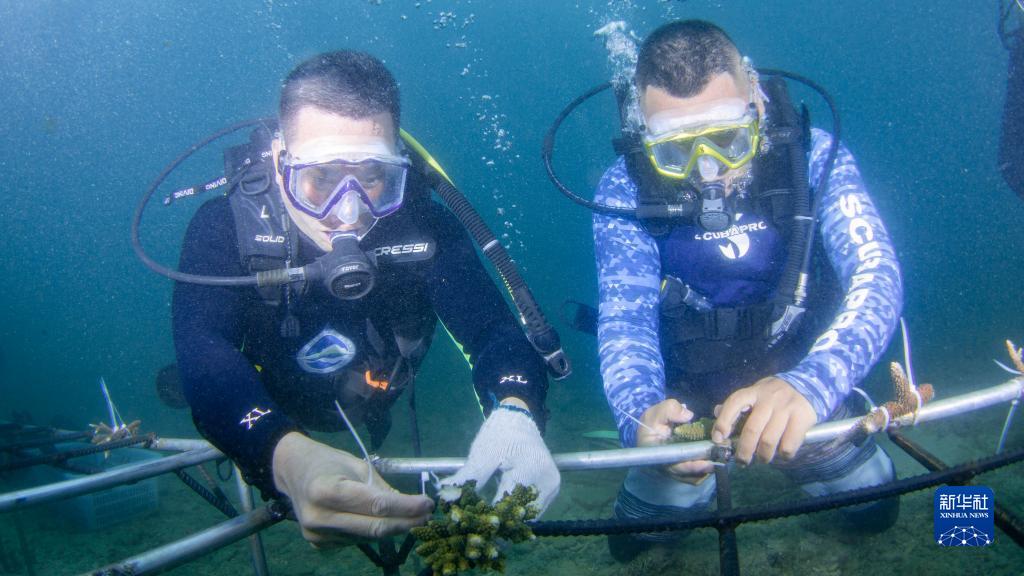 6月7日,海南省海洋与渔业科学研究院的专家在分界洲岛附近海域移植珊瑚。