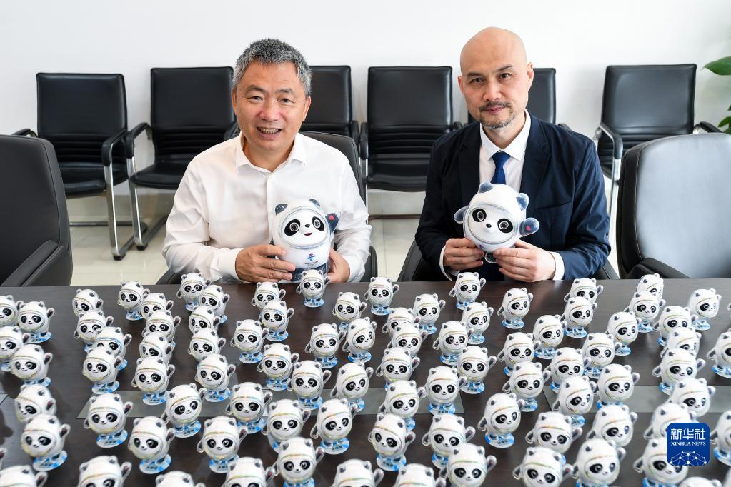 6月8日,广州美院党委书记谢昌晶(左)和冰墩墩设计总执行刘平云给毕业生的冰墩墩签名。