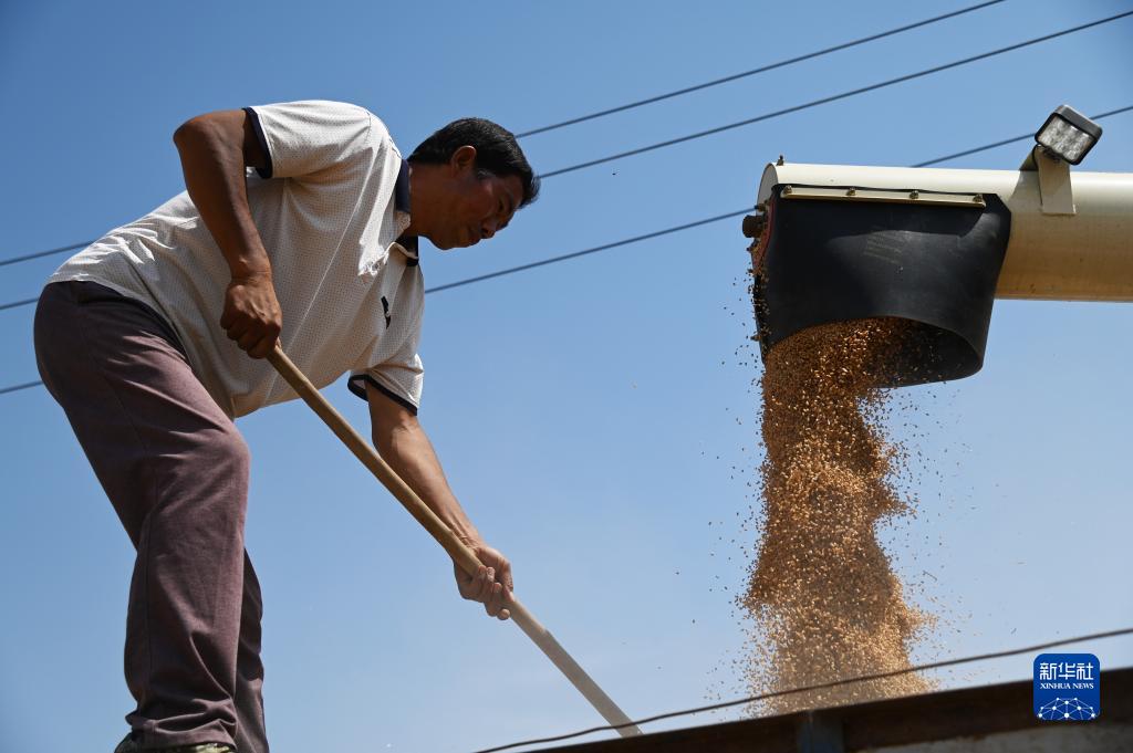 6月7日,在卫辉市刘板桥村,刘建儒在将收获的新麦装车。