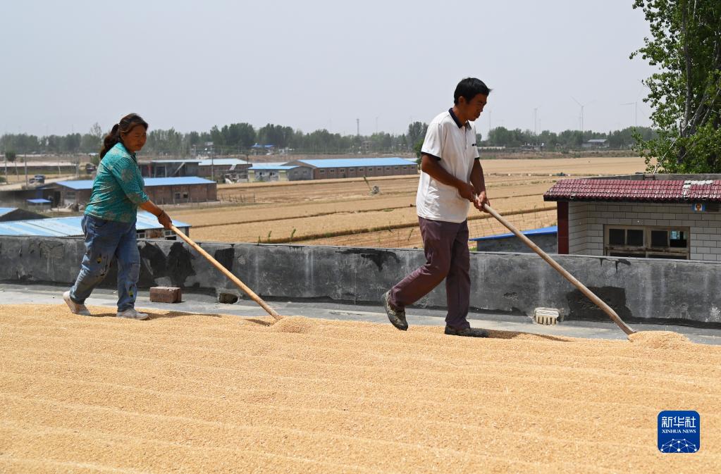 6月7日,在卫辉市刘板桥村,刘建儒(右)和牛玉苹在晾晒新麦。