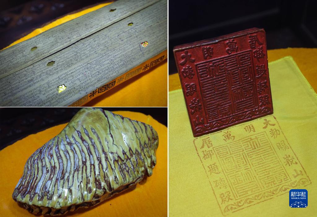 珍藏在峨眉山景区万年寺的“三宝”:贝叶经(左上)、佛牙(左下)和御印(6月6日摄,拼版照片)。