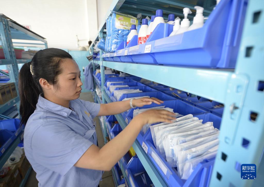 6月7日,四川新万兴碳纤维复合材料有限公司库房保管员在整理防疫物资。