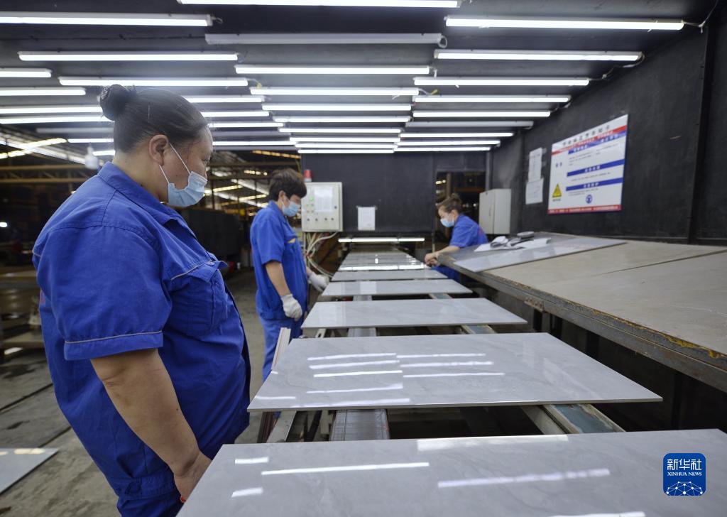 6月7日,索菲亚新型建材有限公司员工检查瓷砖质量。该公司疫情期间停工四天后复工复产。