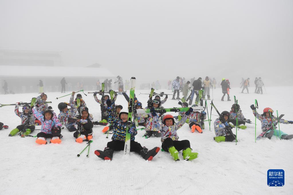 1月9日,湖州市安吉县山川小学学生在云上草原滑雪场练习滑雪后留影。