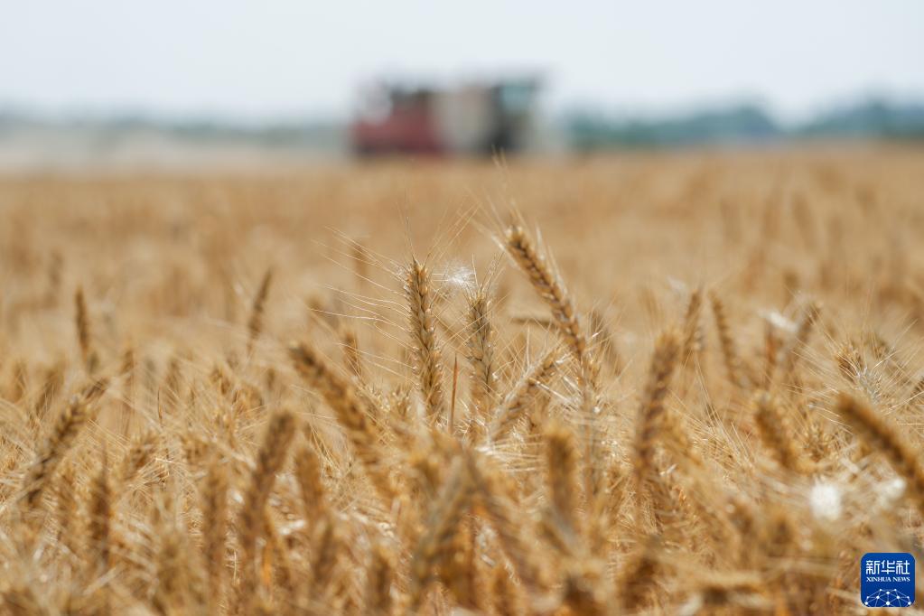 6月7日,在安徽省亳州市涡阳县店集镇宋来宝农作物种植专业合作社,收割机在麦田中收割小麦。