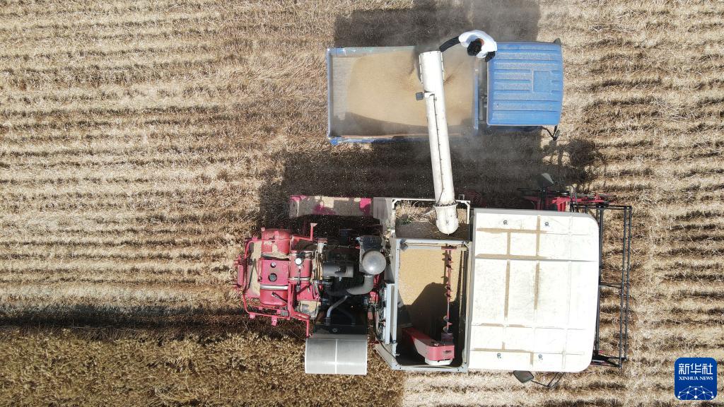 6月7日,在安徽省亳州市涡阳县店集镇宋来宝农作物种植专业合作社,收割机在麦田中收割小麦(无人机照片)。