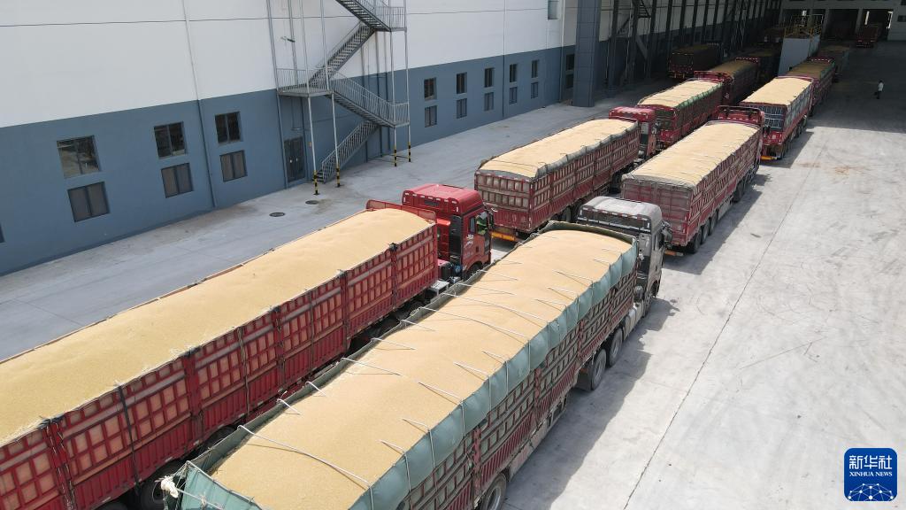 6月7日,在安徽金沙河面业有限责任公司,小麦运输车辆等候卸货(无人机照片)。