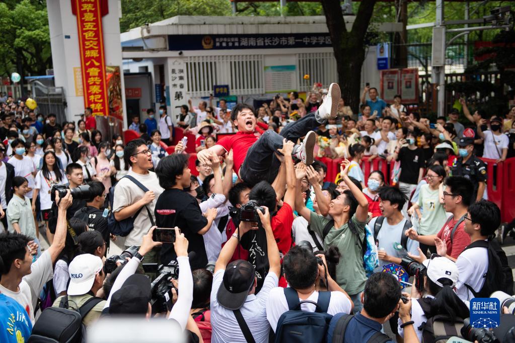 6月9日,在湖南省长沙市一中考点外,学生抛起老师庆祝高考结束。