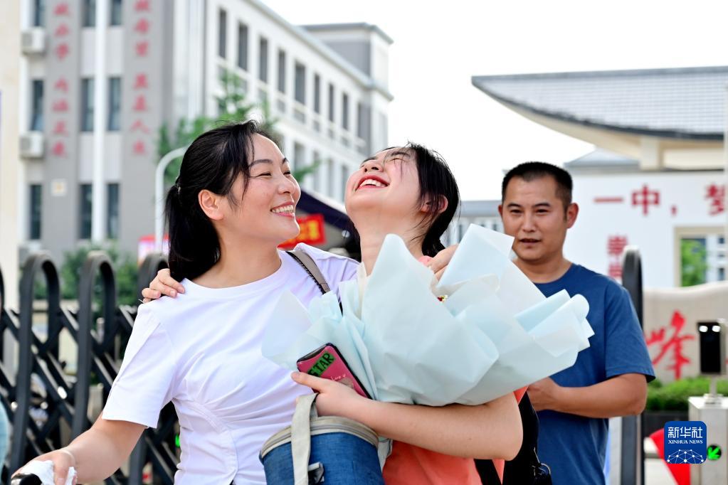 6月9日,在湖南省双峰县第一中学考点,家长为结束高考的考生送上鲜花。