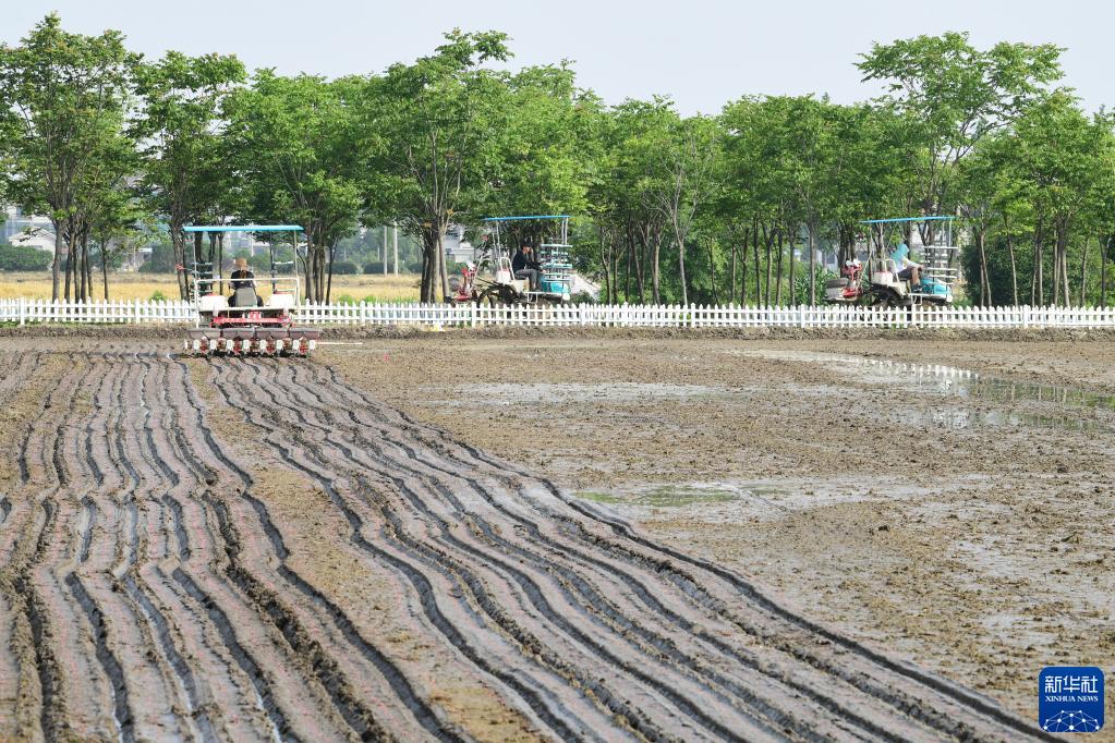 6月9日,在江苏苏州太仓市双凤镇万亩绿色优质水稻基地,农民在田间进行水稻直播。