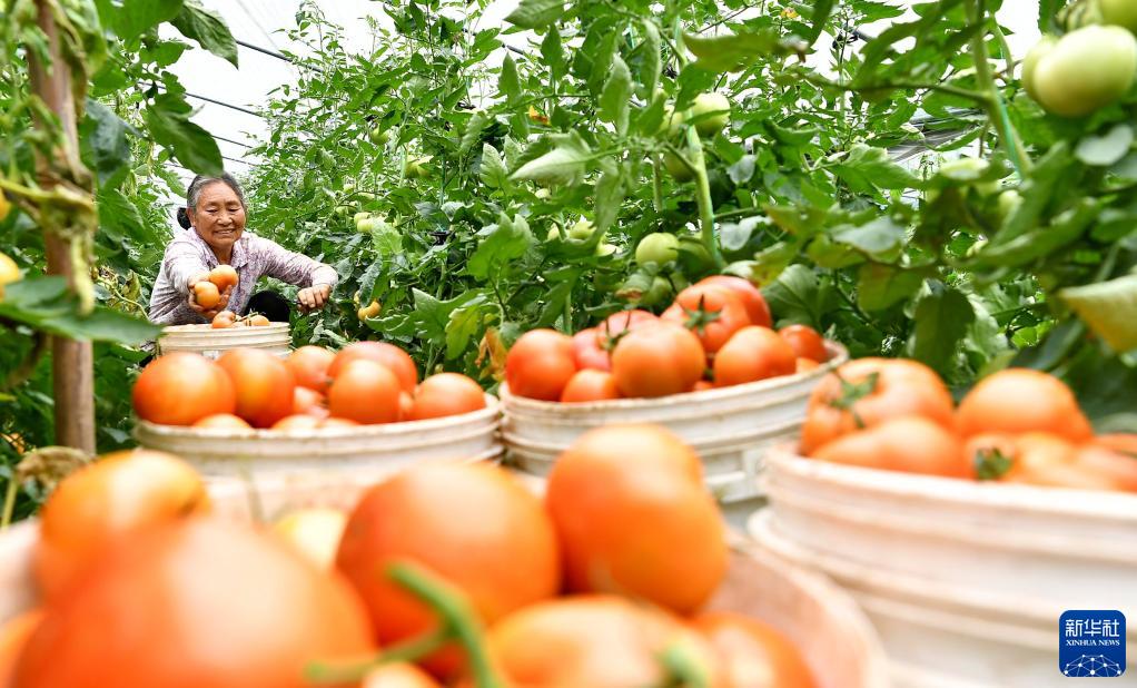 6月9日,四川省广安市武胜县三溪镇观音桥村的农民在采摘西红柿。