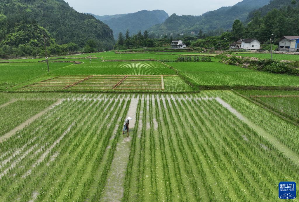6月9日,在湖南省湘西土家族苗族自治州吉首市矮寨镇大兴社区,农民在稻田里耘田追肥。