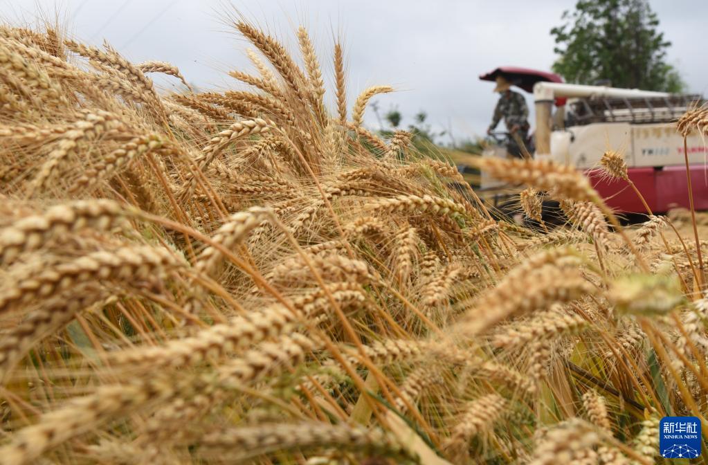 6月8日,收割机在云南省丽江市玉龙县黄山镇白华社区的麦田里收割小麦。