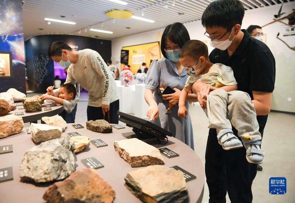 6月9日,家长带着孩子在“24小时博物馆”内参观岩石标本。