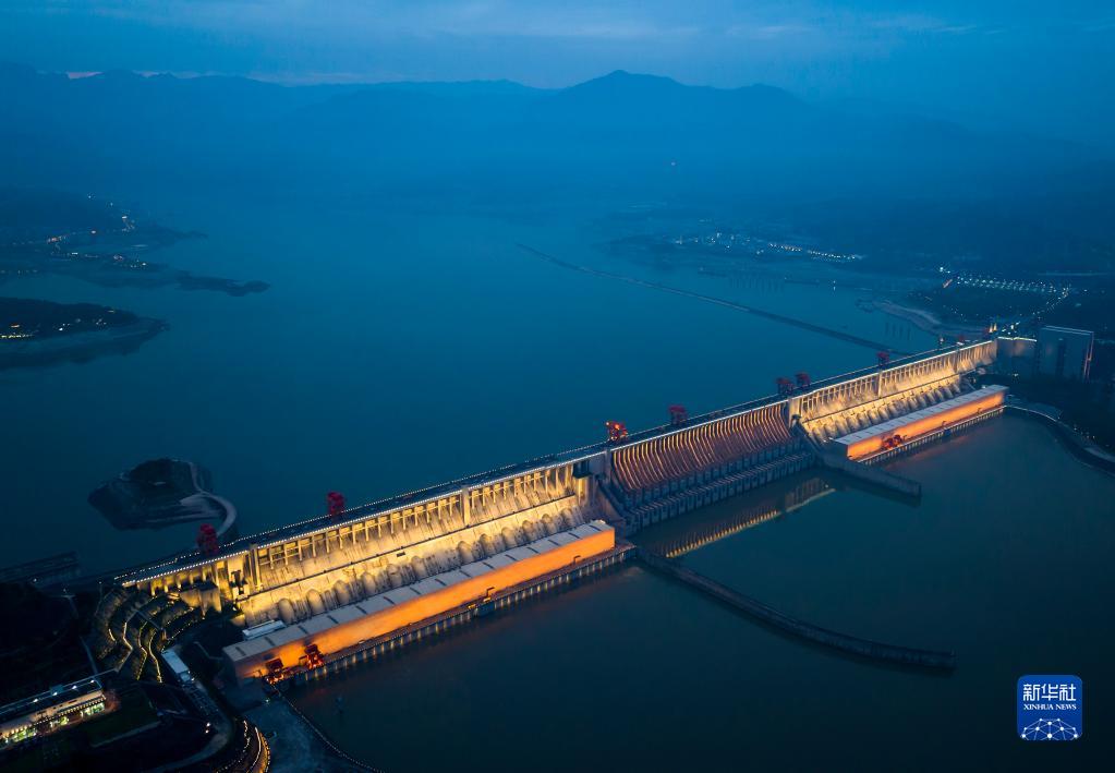 6月9日拍摄的三峡水库水位下降后的三峡大坝夜景(无人机照片)。