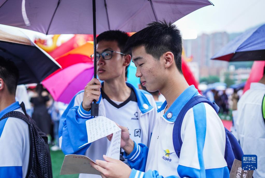 6月9日,贵阳市乌当中学高三学生在雨中阅读父母写给他的信。