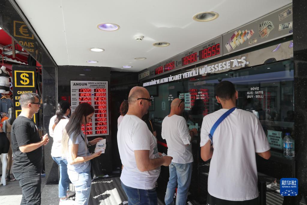 6月9日,在土耳其伊斯坦布尔,人们来到一处货币兑换点办理业务。